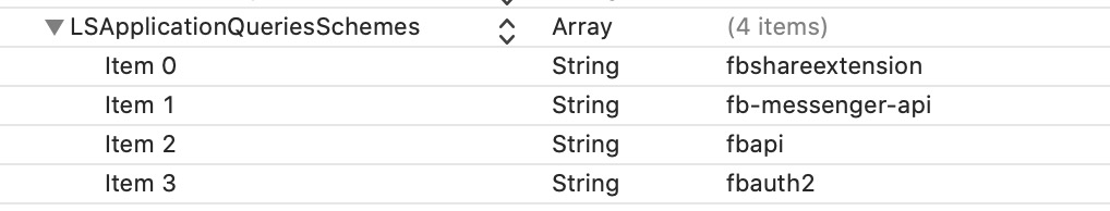 <key>LSApplicationQueriesSchemes</key><array><string>fbshareextension</string><string>fb-messenger-api</string><string>fbapi</string><string>fbauth2</string><string>fbapi20130214</string><string>fbapi20130410</string><string>fbapi20130702</string><string>fbapi20131010</string><string>fbapi20131219</string><string>fbapi20140410</string><string>fbapi20140116</string><string>fbapi20150313</string><string>fbapi20150629</string><string>fbapi20160328</string><string>fbauth</string><string>fb-messenger-share-api</string><string>fbshareextension</string></array>