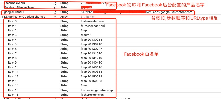 需要在info.plist的URLtype中填写Facebook参数,id处填入”FacebookAppID”,红线处填入”fb+facebookid”格式,所需参数由运营提供