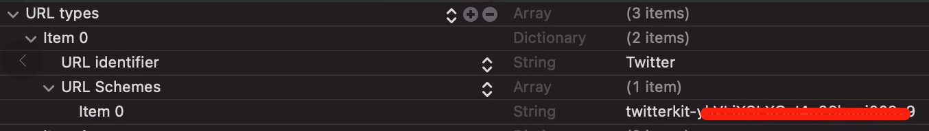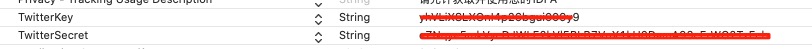 需要在info.plist的URLtype中填写Twitter参数,id处填入”Twitter”,红线处填入”twitterkit- + TwitterKey”格式,所需参数由运营提供