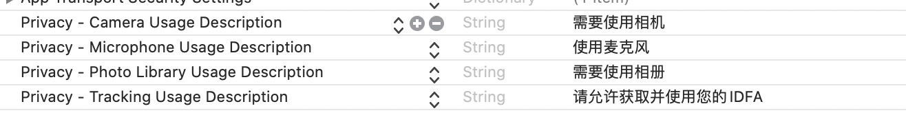 <key>NSUserTrackingUsageDescription</key><string>idfa权限描述请联系运营获取</string><key>LSRequiresIPhoneOS</key><true/><key>NSPhotoLibraryUsageDescription</key><string>需要使用相册</string>