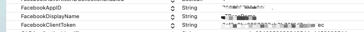 <key>FacebookAppID</key><string>FacebookID</string><key>FacebookDisplayName</key><string>facebookname</string><key>FacebookClientToken</key><string>新增token</string>