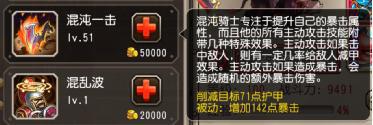 小技能混沌一击,主身和分身概率释放减甲,并且提高暴击伤害,这个技能为混沌骑士的分身提供了减甲的功能,同时混沌骑士的所有攻击技能都有这个技能的效果。从数值上来看满级的混沌一击可以提供109点减甲和218点暴击,经过测试,由这个技能带来的减甲效果不叠加,发挥上不会特别显眼,算是锦上添花,而被动提升的218点暴击值以及随机附加的暴击伤害,对于混沌骑士来说更为重要。