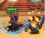 作为混沌骑士的核心输出和收割技能,这个技能可以算是十分独特了,由于伤害计算的特性,在敌方满员时能累积到更多的总伤害,随机分配之后伤害波动更大,而敌方减员后伤害更加稳定,这个技能的优势在于,存在重创敌方英雄的概率,竞技场中,伤其十指不如断其一指,一个关键的高伤往往能扭转战局。从实际测试来看,这个大招只计算敌方英雄单位的个数,从图中可以看出并不会针对召唤物,所以伤害发生的不同情况一般就是在场上剩余1~5个英雄的情况下变化,当然双子分身算是英雄单位,所以是存在计算6个单位的情况。