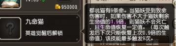 觉醒技能九命猫,受到致命伤时,如果伤害没有达到剩余血量的1.9倍,则猫妖不会死亡,并且恢复生命值。对于这个技能,从未见过如此厚颜无耻的保命技,由于这个技能的存在,使得猫妖在濒死状态下,能致死的伤害需要要求很高,普通的多段伤害,很难打死猫馆长,举一个简单的例子,九命猫面对DP时,在DP全程大招下面不改色,除了强控和高爆发之外,似乎只能用毒伤并且用小技能收割了,要知道,猫馆长每个小技能都有3S无敌时间,打几下还会跑掉,想要抓住,谈何容易!