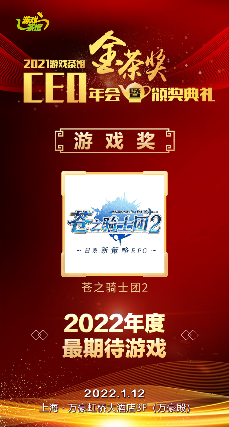 由游戏茶馆主办的第九届CEO年会暨金茶奖颁奖典礼将于2022年1月12日在上海万豪虹桥大酒店举行。经过一个半月的激烈角逐,第九届金茶奖各个奖项的评选终于尘埃落地。龙图游戏旗下新游《苍之骑士团2》荣获“2022年度最期待游戏”大奖!