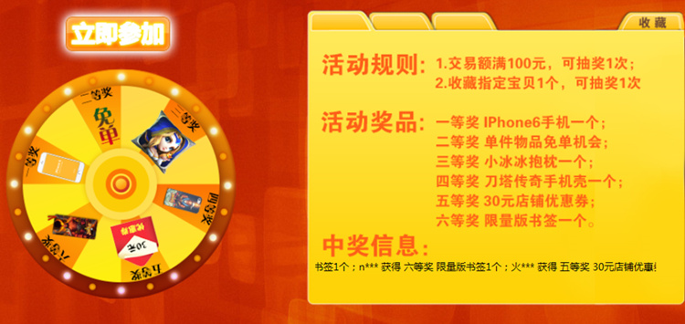所有的活动开展期间,都有相应的优惠在等你,全场包邮,抽奖“迎娶”iphone6,百元优惠券,好评送彩票,各种奖品目不暇接。