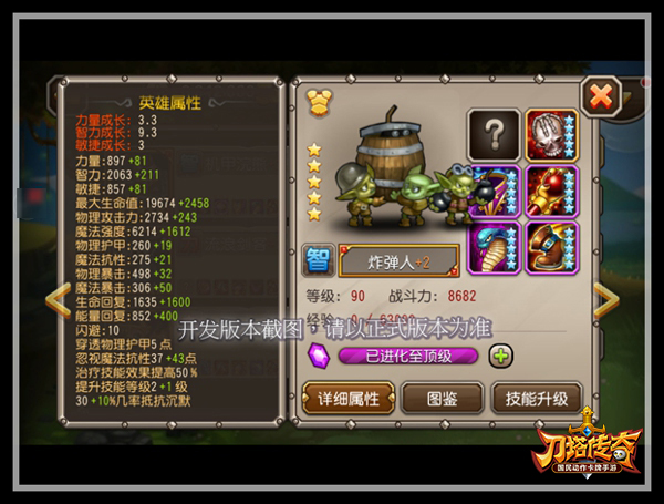 自爆:牺牲小我而成全大我,炸弹人奋力冲向敌人,誓要与自己同归于尽。对一定范围内的敌人造成巨大的魔法伤害。该技能在炸弹人血量低于20%时自动触发。