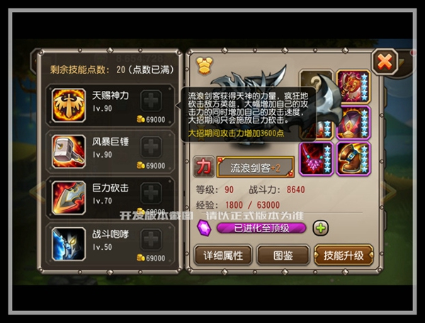 天赐神力:流浪剑客获得天神的力量,疯狂地砍击敌方英雄,大幅增加自己的攻击力的同时增加自己的攻击速度,大招期间只会施放巨力砍击。