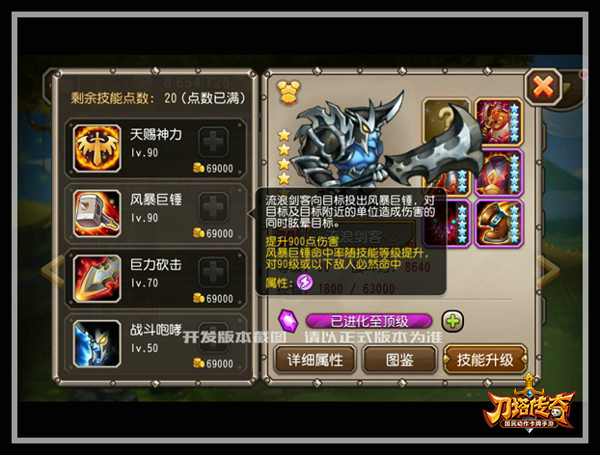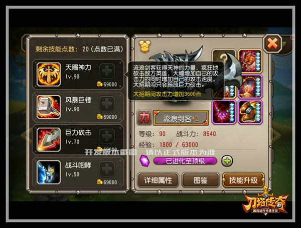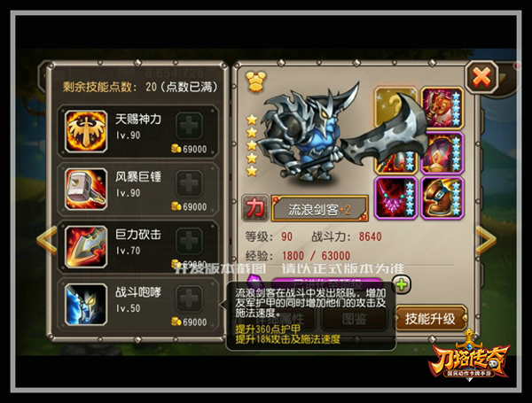 大招“天赐神力”是流浪剑客标志性的输出技能,也是“百变星君”的由来。变身后马力全开,只使用巨力砍击技能,对目标敌人造成伤害的同时,被攻击的敌人附近的敌方单位也将受到溅射伤害。