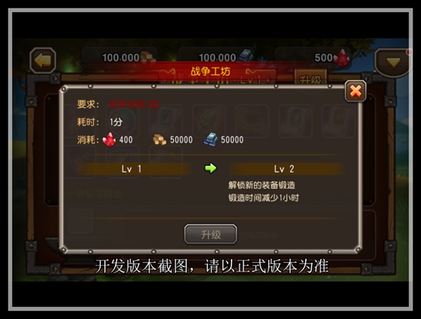 当战争学院达到新的等级后,队长们需要花费一定的时间和材料,将战争工坊提升至新等级。当建筑提升等级后,不仅在外形上会有更宏伟的变化,在功能和能力范围上也有提升。