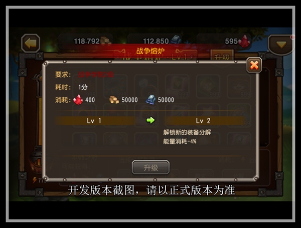 跟战争工坊一样,战争熔炉也需要达到一定要求,并消耗一定的资源和时间,才能解锁下一等级,开启新的可分解装备,分解时所消耗的能量更少。