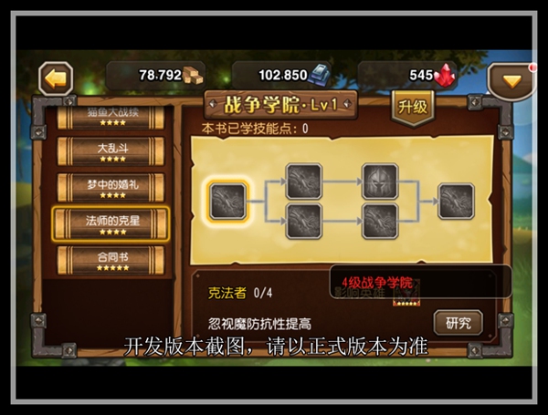 学院里有很多不同种类的魔法书,每套魔法书会涉及到几个英雄,研究技能可以增强这些英雄的属性。