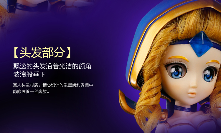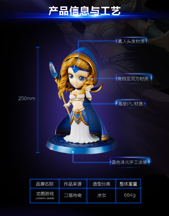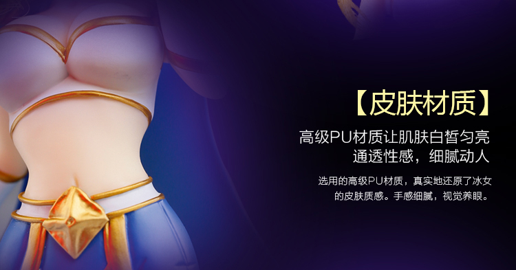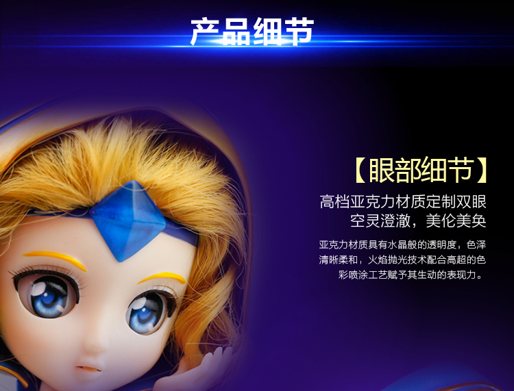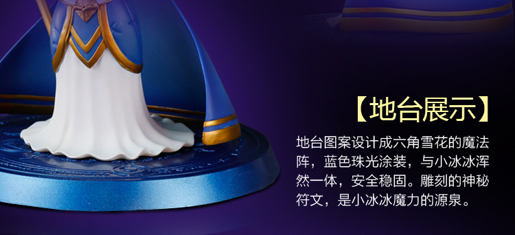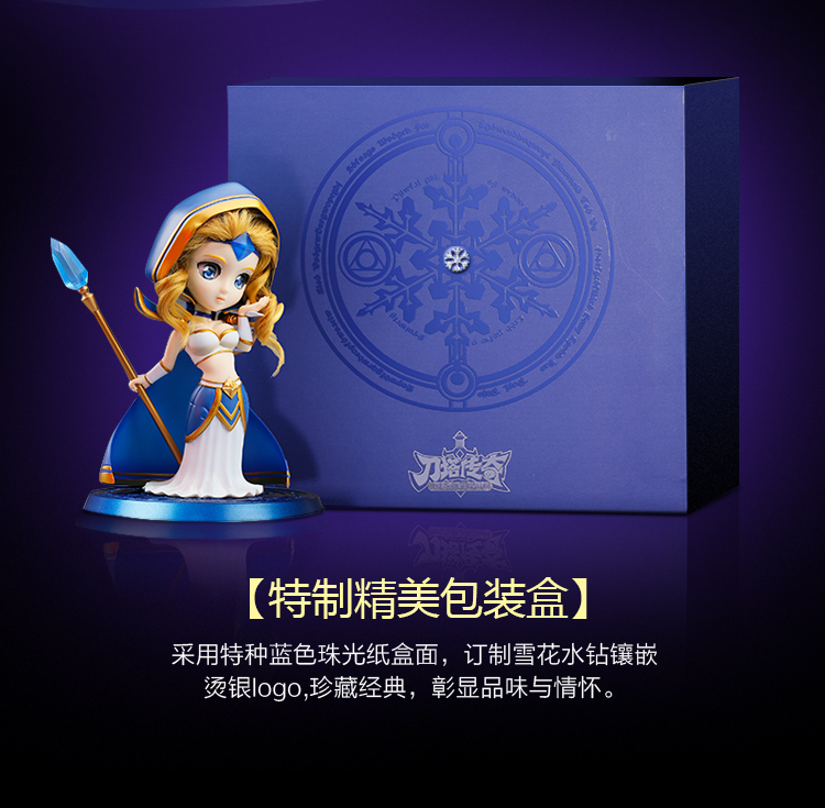 为了让眼睛更加空灵澄澈,含情脉脉,经过反复选材测试,最后选用了高档亚克力材质,并使用了火焰抛光工艺。为了让皮肤更加通透细腻富有质感而又抗氧化耐磨损,特别选用了定制的高级PU材质。为了让冰冰的头发更加真实,选用的是真人头发,并精心设计了发型,以达到更真实的效果。而整个手办的雕刻工艺更是完全可以和日本最高水准的SD娃娃相媲美。同样,即便是包装也是煞费苦心。天地盖蓝色珠光纸面,镶嵌了特别定制的雪花造型水钻,标示以《小冰冰传奇》烫银LOGO,仅就包装本身而言,也已经达到了艺术品的标准。