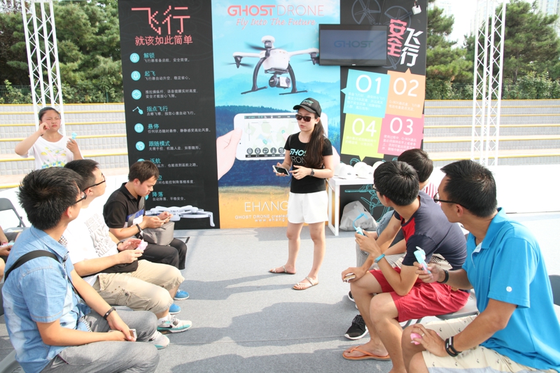 实操体验前,教练以图文讲解的形式提供教学。教学内容包括起飞、指点飞行、悬停、跟随模式、返航等基本的无人机操作要领,而这些只需要通过手机APP即可操作亿航公司旗下的智能无人机。通过书面教学,现场玩家掌握了无人机驾驶的简单知识。随后教练还进行了实际操作,并对部分玩家进行手把手教学,让玩家进一步掌握与熟练无人机操作的方法。