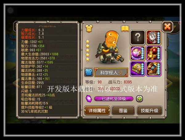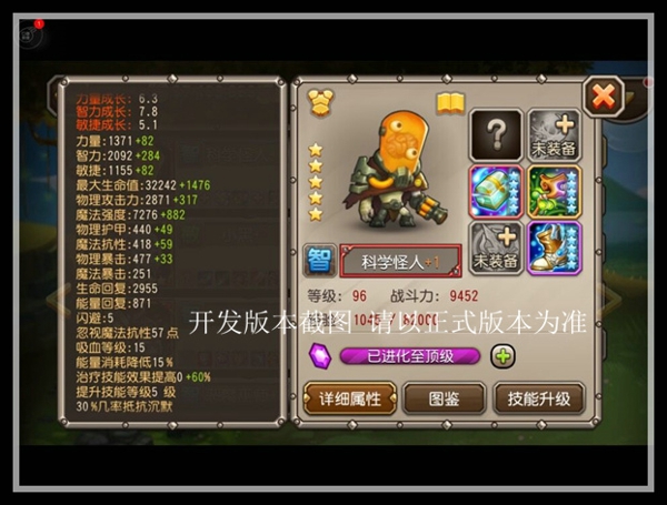 可以看到,橙2的科学怪人已经拥有7000法强,而红1的他在未满装状态下法强已经突破8000,配合一技能永久加攻击,科学怪人将越战越勇。除此之外,科学怪人还拥有不俗魔抗,加上四技能全队魔抗加成,科学怪人对抗法师将十分出彩!