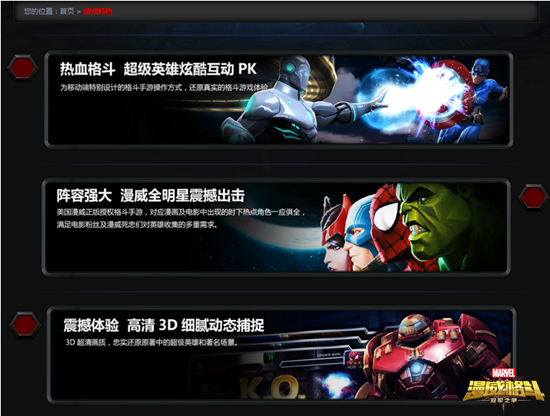 《漫威格斗:冠军之争》是一款由美国漫威公司正版授权,KABAM研发制作的以超级英雄为卖点热血格斗手游。由龙图游戏在大陆代理发行。本作的核心特色是全面收录了漫威旗下的超级英雄,受到了国内漫威爱好者的广泛关注;本作采用3D高清画质,高度还原了漫威超级英雄们风采,同时为玩家提供了生动逼真的视觉享受;游戏以手机用户习惯的滑动和触碰为基础开发了专用的操作模式,无论是否格斗游戏高手都可以轻松的发动必杀技和连续技,充分享受超级英雄对战带给玩家的无穷乐趣。《漫威格斗》计划未来与漫威电影同步,尽可能多的将漫威旗下的超级英雄植入游戏内,不断为用户带来新鲜感与满足感。