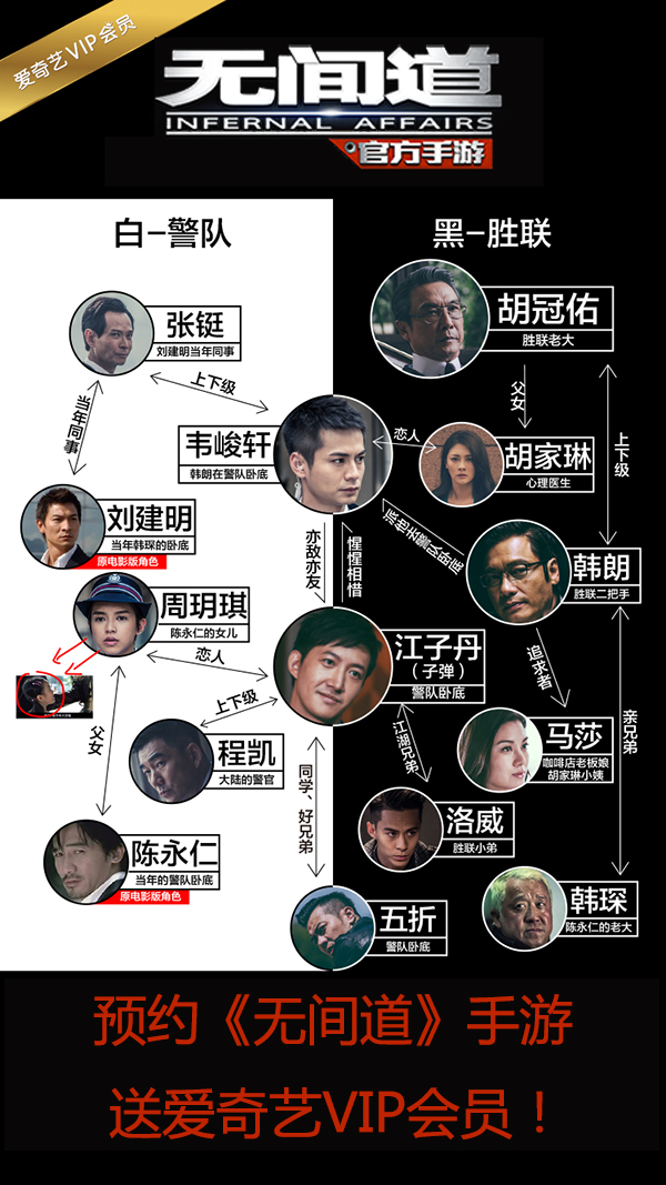 由龙图游戏与爱奇艺游戏携手合作共同发行的《无间道》手游拥有“无间道”电影、网剧正版IP授权。在“无间道”迎来15年之际,《无间道》手游即将横空出世,为玩家带来一场轰烈的无间风云奇观!为向警匪卧底经典致敬,《无间道》手游将整部剧全部完美还原到游戏中,人物、场景、剧情甚至到小物件,都是你所熟识的。