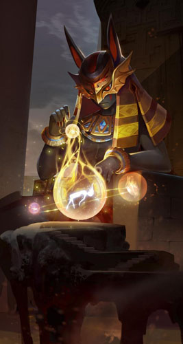 圣甲虫之怒(大招):毒狗召唤圣甲虫在场内巡视,并对一个目标敌人施加标记(标记只有我方可见,敌人无法看见,在大招引导期间毒狗免疫控制,竞技场内将会选择能量最高的敌人)。在圣甲虫巡视期间,如果敌人释放大招,将会被圣甲虫击飞并造成伤害,之后圣甲虫会对范围内敌人释放毒液,让所有拥有法老病毒的敌人获得一个新的变异病毒。