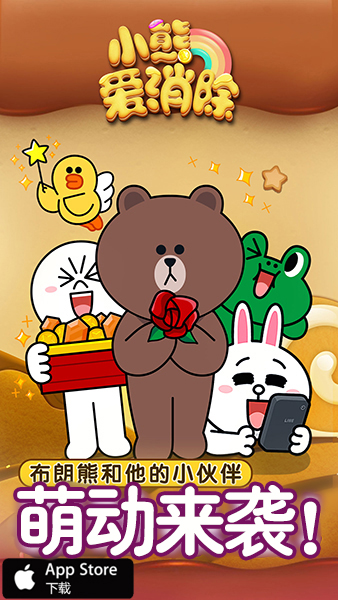 LINE正版授权,《小熊爱消除》游戏内满是呆萌可爱的布朗熊和他的小伙伴们,俏皮的可妮兔、温暖的莎莉,还有更多LINE角色聚集在《小熊爱消除》中,喜欢他们就来游戏中与他们见面吧!