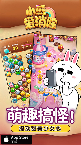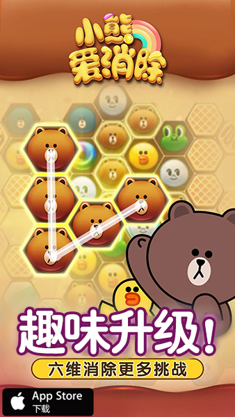 《小熊爱消除》是由龙图发行的六边形消除手游。获得LINE正版授权,以LINE经典卡通角色为元素,精心设计45个主题章节、超过500个充满奇趣的关卡。分数关、钥匙关、巧克力关……独特的消除方式与华丽的消除特效,带来妙趣横生的挑战和轻松愉悦的成就感。更可与好友互动、挖掘无限惊喜福利,尽情享受休闲乐趣!