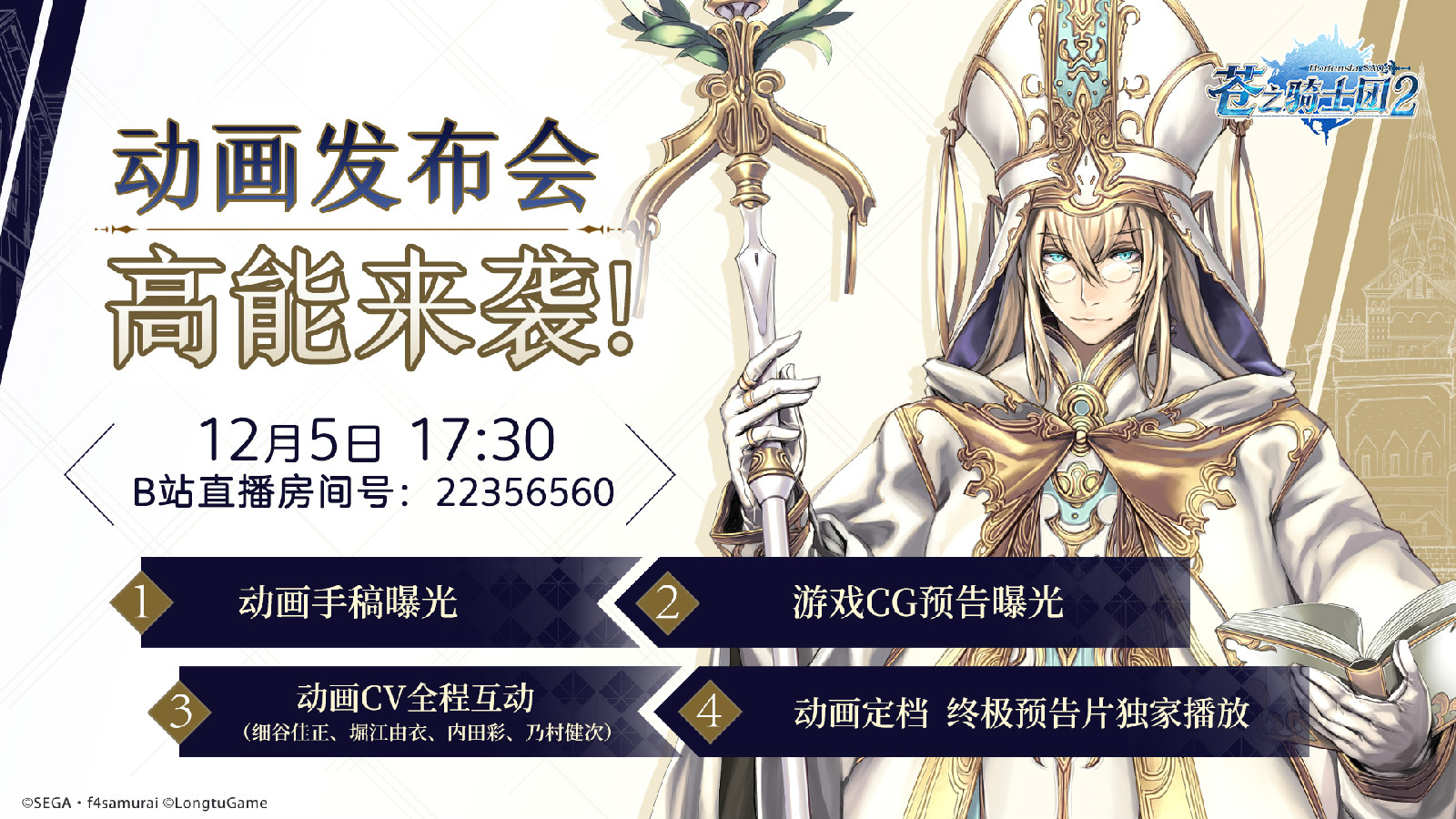 关于《苍之骑士团》动画,另一个次元的主角们,堀江由衣、细谷佳正、内田彩、梅原裕一郎将做客发布会节目,畅谈配音过程中的趣事,想看看大神们银幕下面的另一面?那就千万不要错过啦!